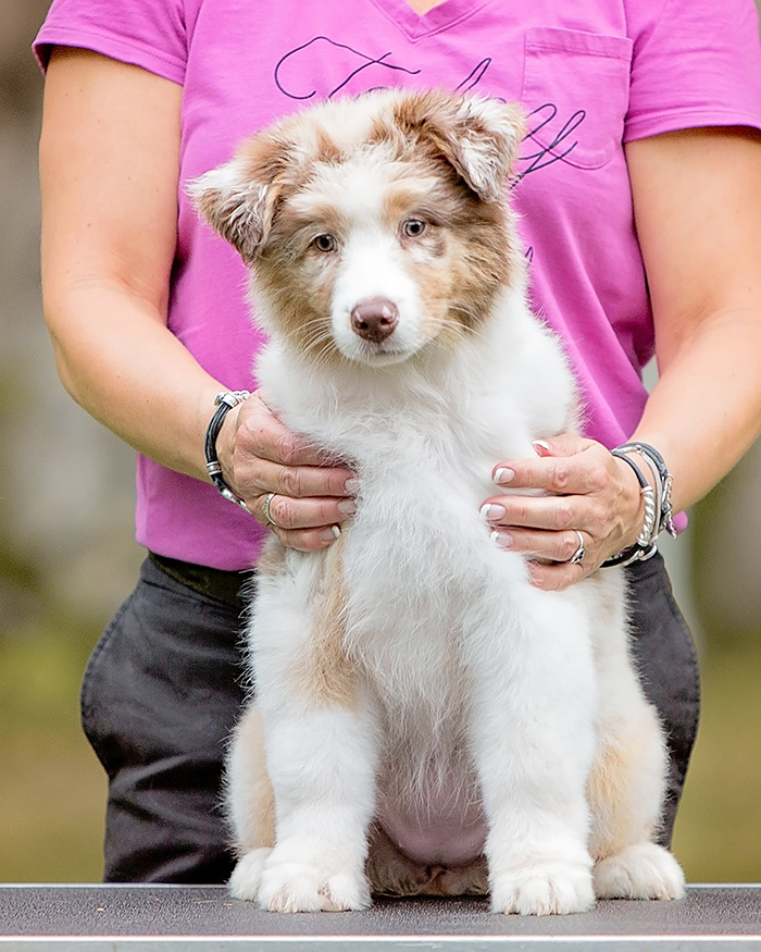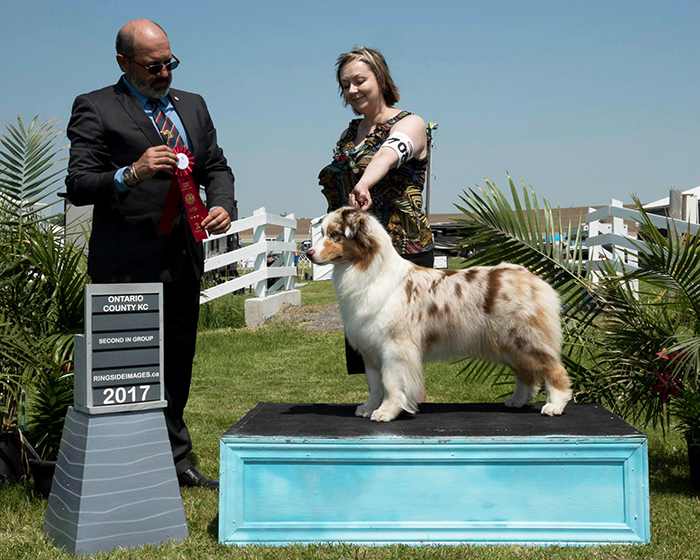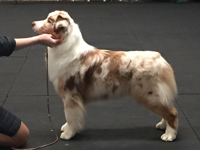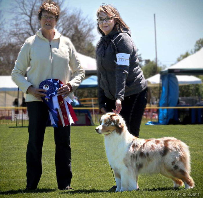 Addy won the 4-6 Red Merle puppy bitch class at the 2015 ASCA National Specialty and was considered for Best of Breed puppy.